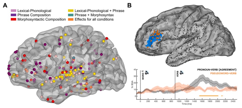 As with the above research sections, my contributions to cognitive neuroscience can be split into empirical and theoretical themes. Using direct intracranial EEG recordings from penetrating depth electrodes in epilepsy patients, my recent experimental research has focused on compositionality in neural systems, revealing that lateral posterior temporal cortex exhibits the earliest sensitivity to compositional phrase structure and hierarchical morphosyntax, independent of lexical information.