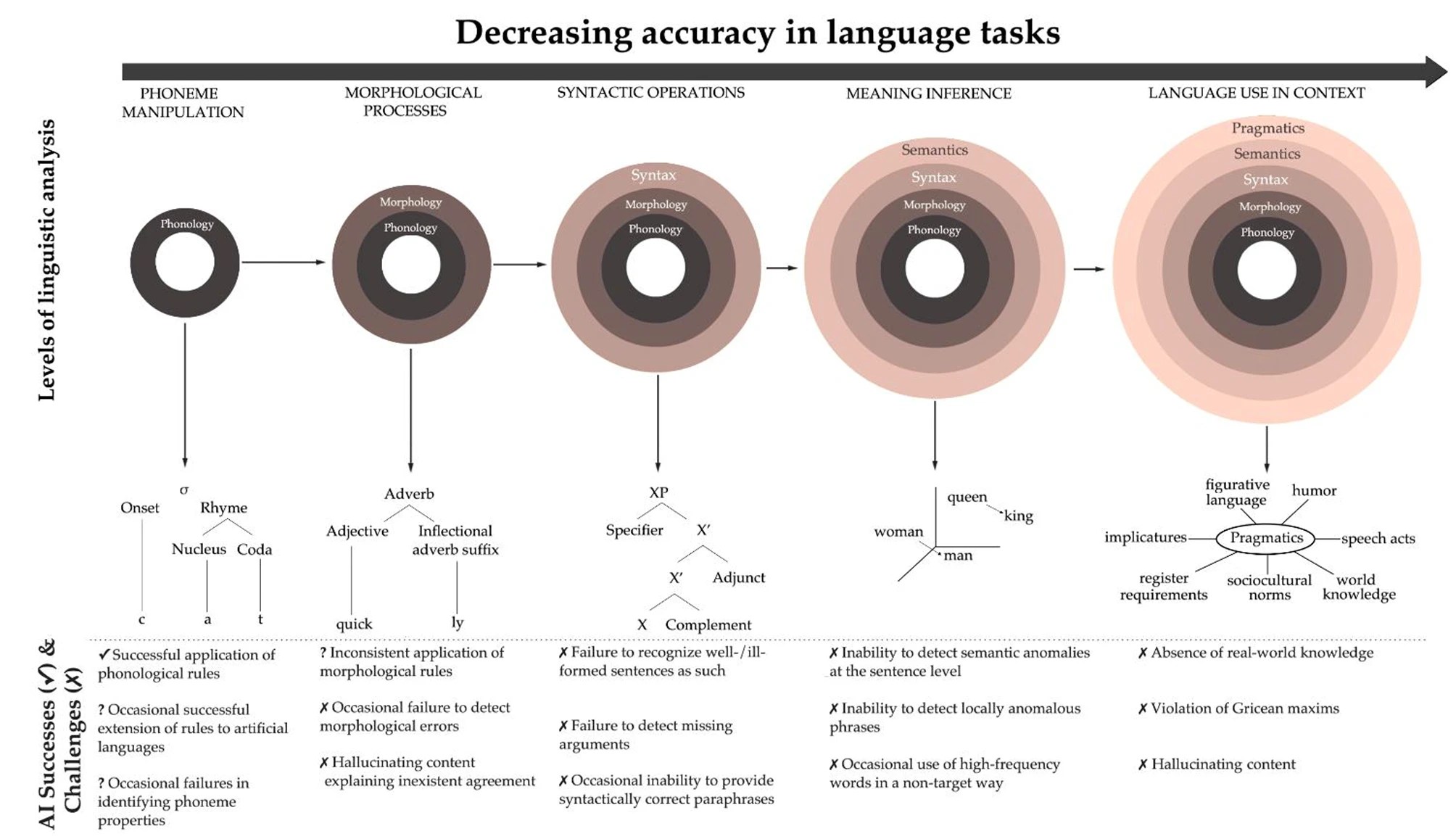 I have explored in both theoretical and empirical papers the limitations of current Large Language Models (LLMs) and text-to-image models (DALL·E 2/3) to parse different forms of compositional structures. In concert with Gary Marcus, Jill de Villiers, Evelina Leivada and others, I have probed a number of leading LLMs for their ability to assess and produce structures adhering to basic principles of hierarchical, recursive, and compositional generation. The general theme here has been to formally characterize, and experimentally probe, the abilities of artificial language models, with a focus on syntactic, semantic and pragmatic competence.